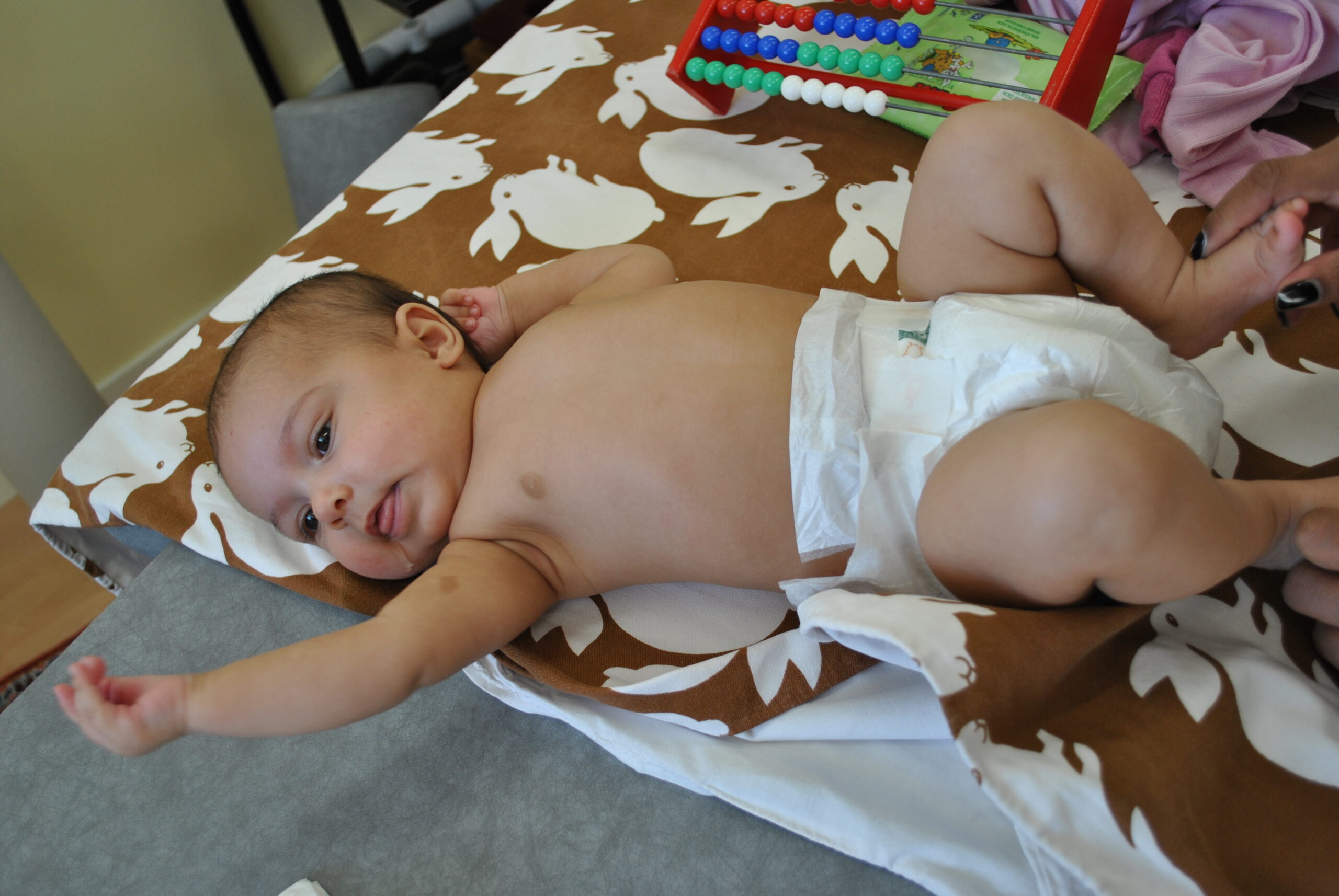I rygg liggande har dem böjda ben, händerna mer så vid ljumsken, knäna. Ibland kan vi med hjälp av en leksak uppmuntra dem att sträcka efter en leksak så med benen tygnd kan dem vrida till sidan.